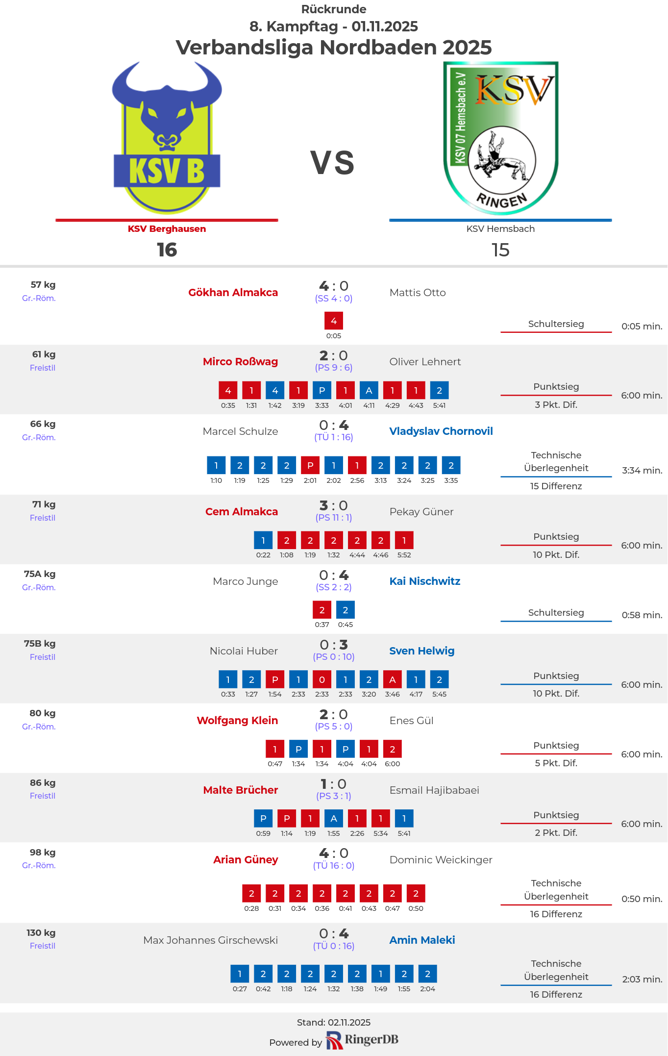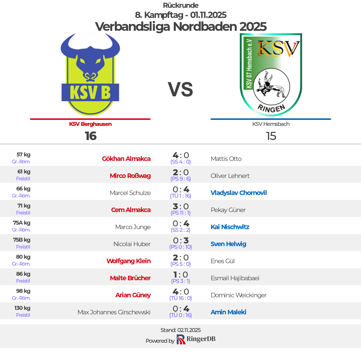 Taktisch starke Auftritte zeigten auch Malte Brücher, der im 86-kg-Freistil den favorisierten Esmail Hajibabaei mit 3:1 bezwingen konnte, sowie Nicolai Huber, der sich mannschaftsdienlich in der für ihn ungewohnten 75-kg-Freistil-Klasse zur Verfügung stellte. Trotz seiner 0:10-Niederlage im abschließenden Duell gegen den ehemaligen Spitzenringer und heutigen Hemsbacher Trainer Sven Helwig sicherte er dem KSV Berghausen letztlich den knappen, aber verdienten Heimsieg.