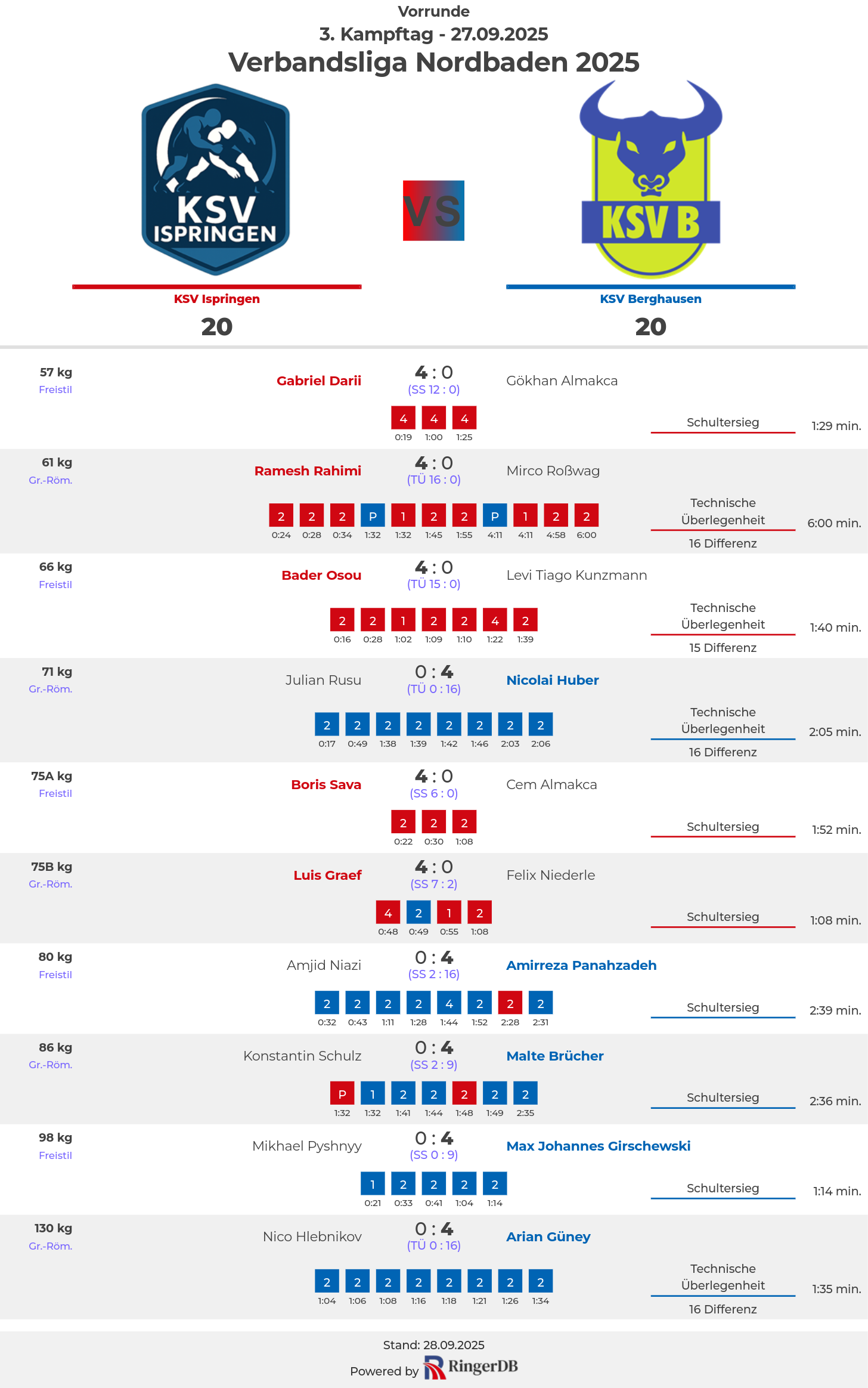 Bei der 20:20 Punkteteilung standen am Ende 5 klare 4:0-Siege und 5 deutliche 0:4-Niederlagen. Sehr bitter war dabei die technisch überhöhte Niederlage von Mirco Roßwag im 61 kg, der die entscheidende Wertung mit dem Schlusspfiff abgab. Und auch die Schulterniederlage von Felix Niederle war so sicher nicht eingeplant.