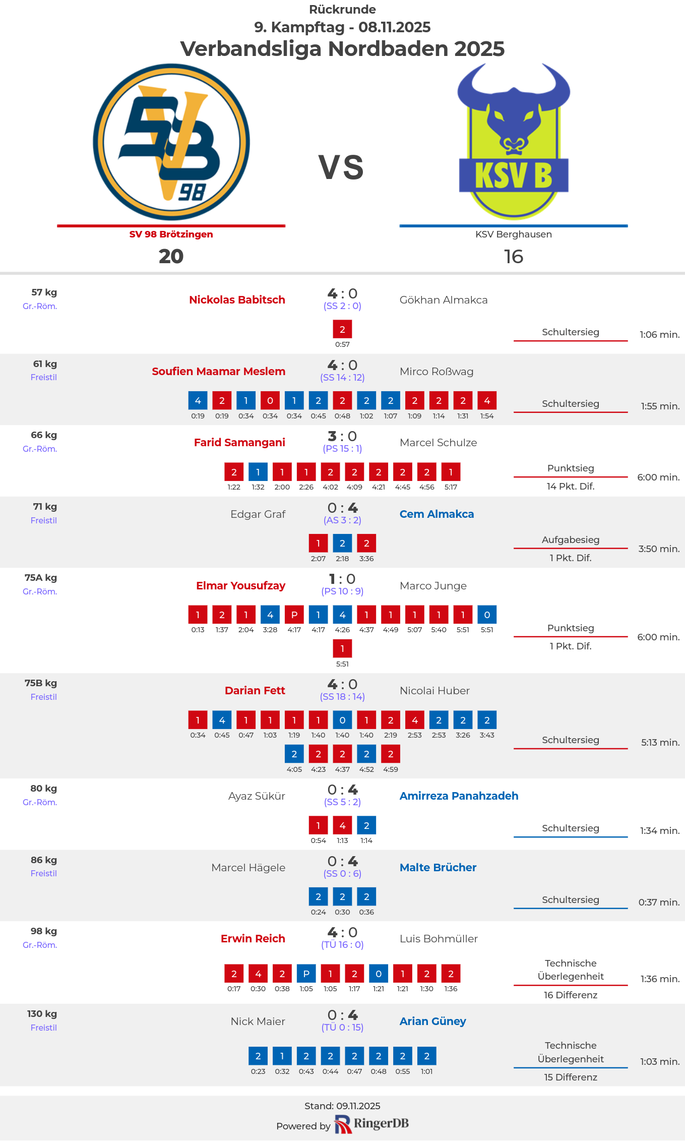 In den Kämpfen von Mirko Rosswag (61fr) und Nicolaj Huber (75fr) ging es heiß her, es fielen zahlreiche Punkte. Beide lagen zwischenzeitlich in Führung, mussten sich jedoch letztlich auf Schulter geschlagen geben.